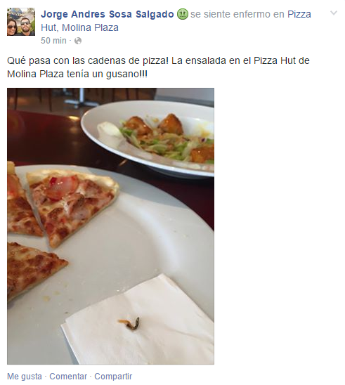 Jorge Andrés Sosa Salgado publicó en su cuenta de Facebook la foto del desagradable momento junto con el mensaje: "¡Qué pasa con las cadenas de pizza! La ensalada de Pizza Hut de Molina Plaza tenía un gusano.